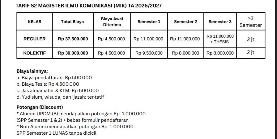 | REGULER | Rp 37.500.000 | Rp 4.500.000 | Rp 11.000.000 | Rp 11.000.000 | Rp 11.000.000 + THESIS | 2 jt |